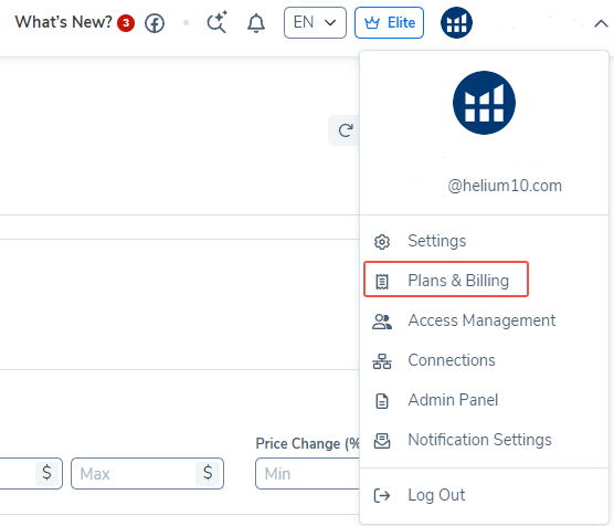 1. From the Helium 10 main dashboard, click on the member profile icon at the top-right corner. In the drop-down menu, select Plans & Billing.