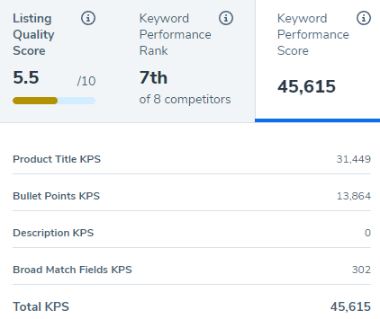 For instance, if your listing has a score of 45,615, the tool will break down the different ways your keywords impact that score.