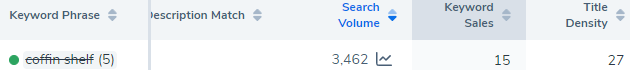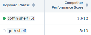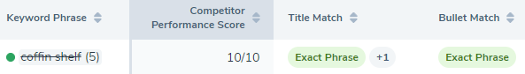 For example, a Competitor Performance Score of 10/10 for "coffin shelf" means that all of your competitors are optimized for this keyword. This would signal that you need to ensure it is effectively placed in your listing to stay competitive.