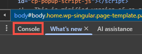 4. Inside the Developer Tools area with the displayed code, click on the Console tab to show the page's developer code.
