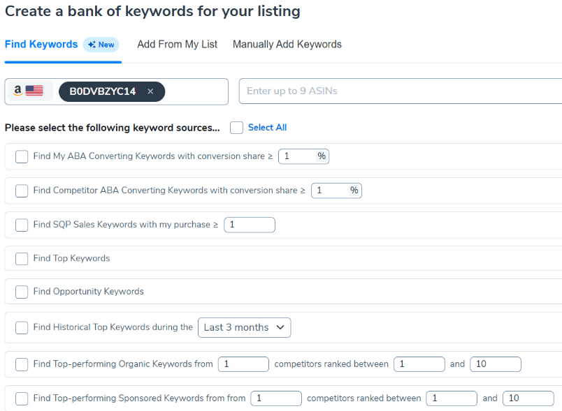 Listing Builder now allows sellers to input competitor ASINs directly into the tool to retrieve relevant keywords from multiple sources—without switching between Cerebro or other keyword tools. This unified workflow streamlines keyword research, listing creation, and optimization.