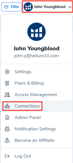 7. Now, it’s time to connect your Walmart account to your existing Helium 10 account. Log in to Helium 10. From the dashboard, access the Connections area in your Profile, using the drop-down menu located in the top-right corner.