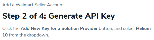 To connect your Walmart account to your Helium 10 account, you will need to begin by logging into your established Walmart Seller Center account. During this process, you will add Helium 10 as one of your approved third-party developers and then copy your Walmart API Key data into your Helium 10 account.