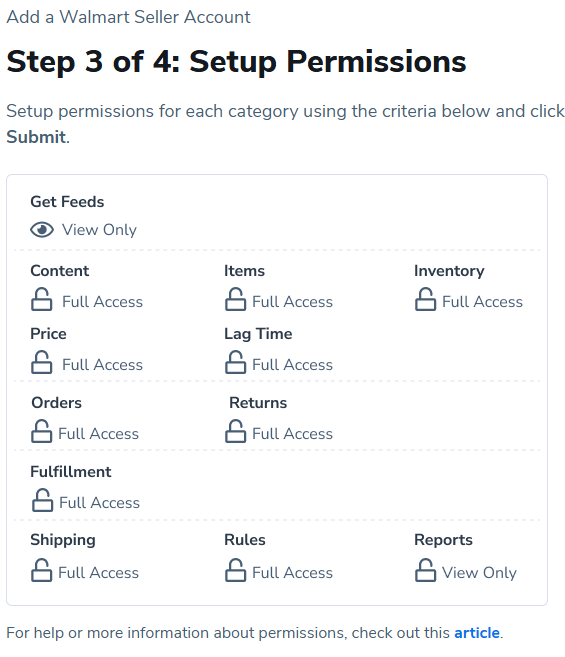 5. Next, set your permissions to allow Helium 10 to import your Walmart data to your Helium 10 account. Take care to set all permissions to full access except for the Get Feeds and Reports items. If you miss one of these required permission settings, you will not be able to connect the accounts. Click the Submit button.