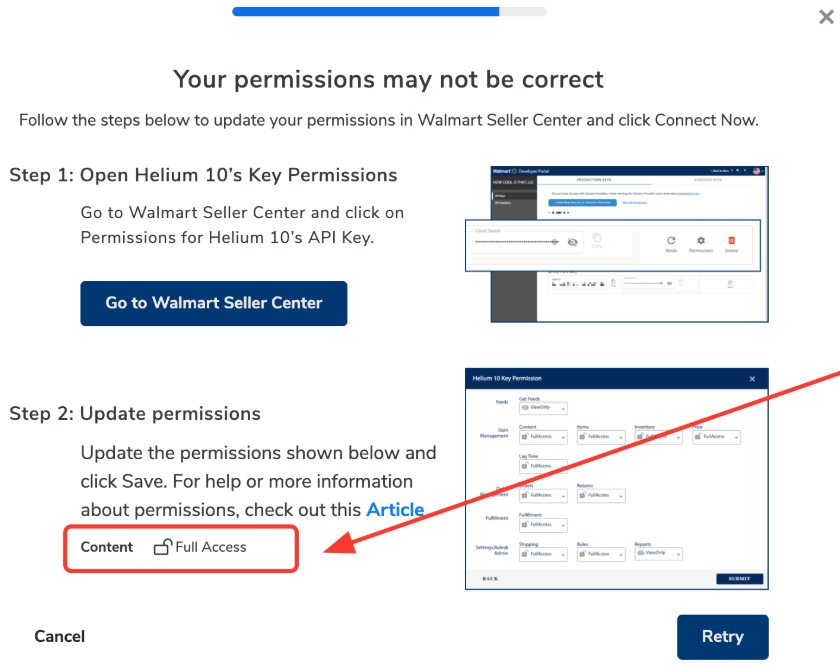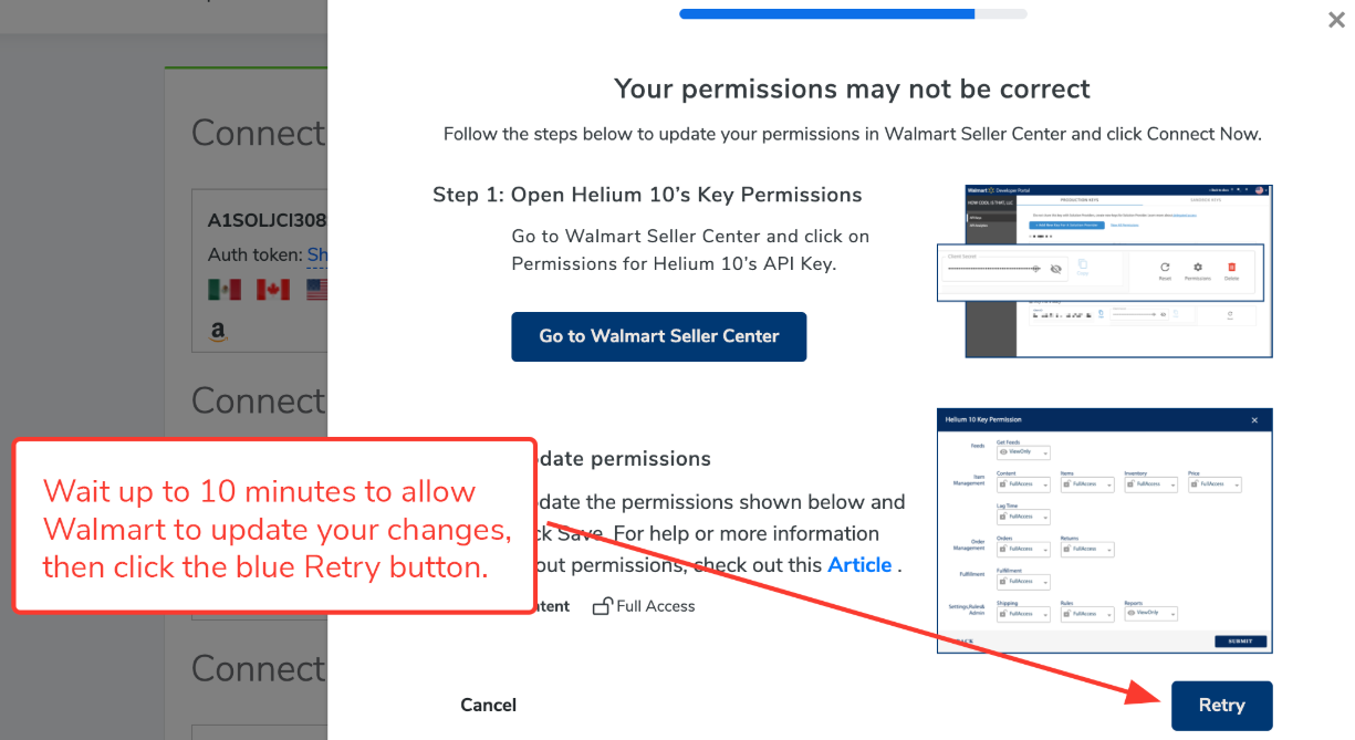 17. After you make the changes in Walmart Seller Center, allow the site up to ten minutes to update or reset its permissions before you click on the blue Retry button.