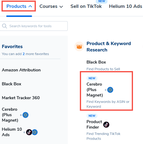 1. To get started, log into Helium 10 and open Cerebro (Plus Magnet) by selecting it from the Products menu.