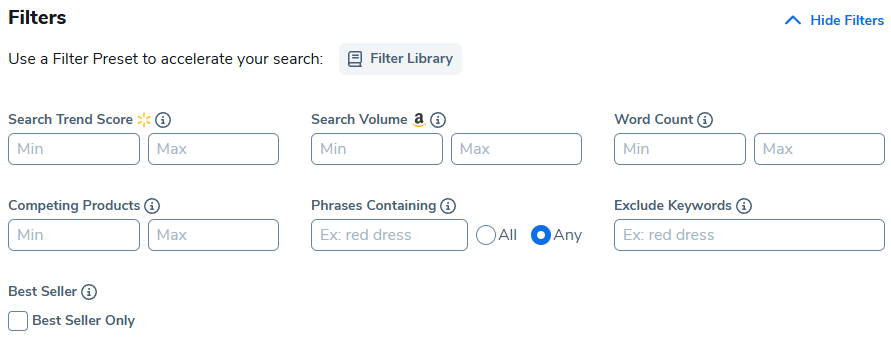 5. The search results will populate a large number of keywords at the bottom. To narrow your search, use the Filters section. Select "Show Filters" to view all available filter options. Once you’ve finished customizing the filters to your liking, select Apply Filters to update the keyword results at the bottom of the screen.