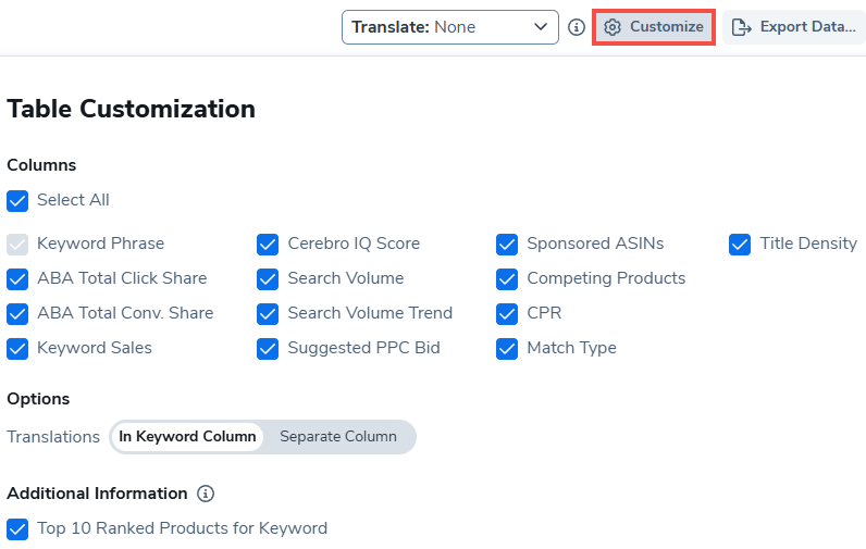 - Match Type: source from which a keyword is drawn (Organic, Smart Complete, or Amazon Recommended).