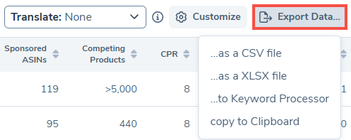 11. Click on the Export Data button to download your keywords, import them into Keyword Processor, or copy to your clipboard.