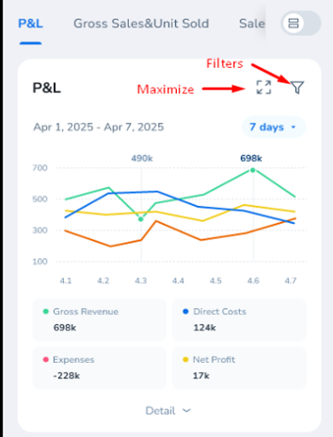 The P&L graph visualizes your financial performance over time. This allows you to quickly spot trends, spikes, or declines in revenue and profit.