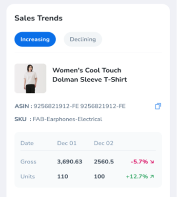 Identifies products with increasing or declining performance. This helps you prioritize restocking winning ASINs or optimizing underperforming listings.