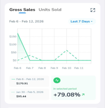 Displays total revenue and unit performance within your selected date range. Includes start and end dates, and percentage comparison to the previous period.