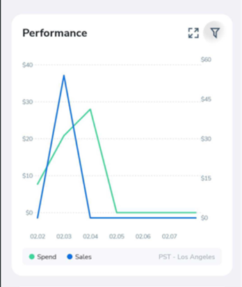 The Performance graph visually displays campaign trends. Use filters to customize which metrics are displayed, and identify spending inefficiencies or revenue growth opportunities.