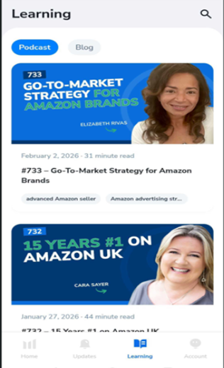 Access Helium 10 blogs and podcasts directly from the app. Content is synced with Helium 10’s education platform and updated regularly.