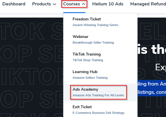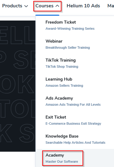 To access the Helium 10 Academy, use the Courses drop-down menu and select Academy.