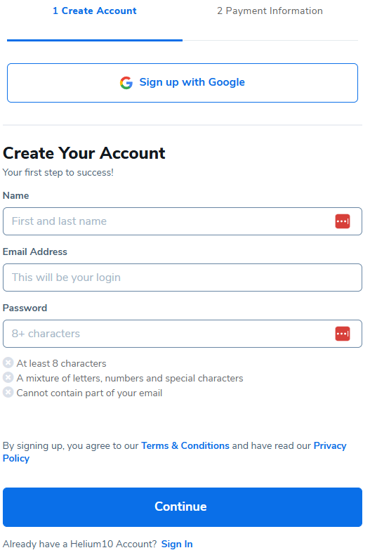 6. After selecting BUY NOW, a form will open to create your account and your eventual login credentials for Helium 10. Create your account by typing in your full name, email address, and password. Click Continue to Payment and enter your credit card details.
